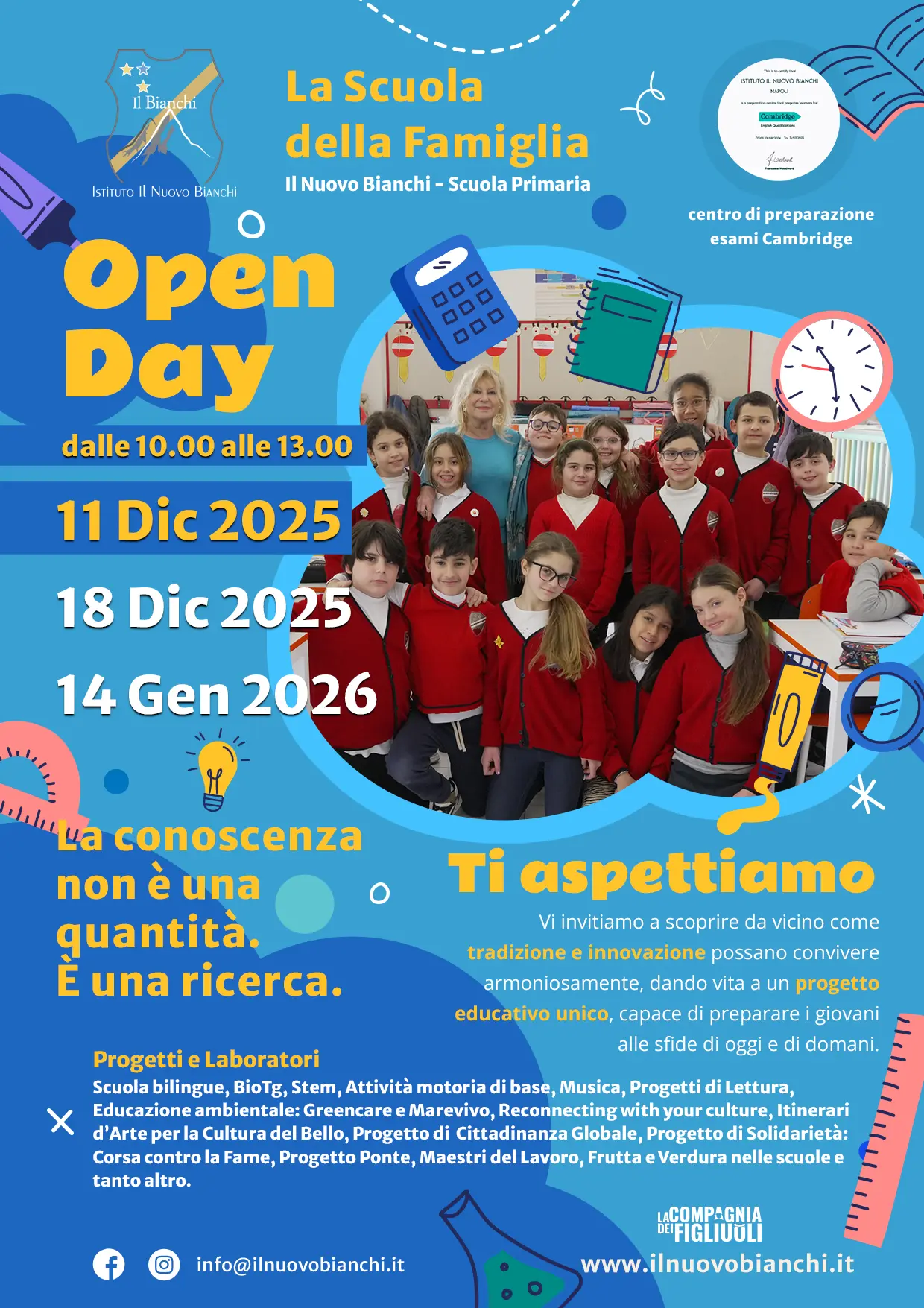 Sarà l’occasione per incontrare docenti, visitare gli spazi, conoscere i nostri progetti e scoprire come, insieme, possiamo costruire il futuro dei vostri figli.
