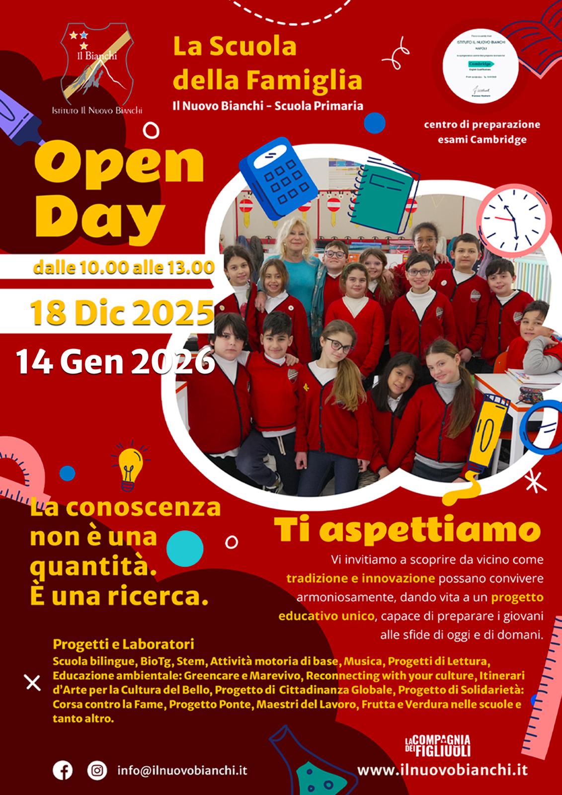 Sarà l’occasione per incontrare docenti, visitare gli spazi, conoscere i nostri progetti e scoprire come, insieme, possiamo costruire il futuro dei vostri figli.